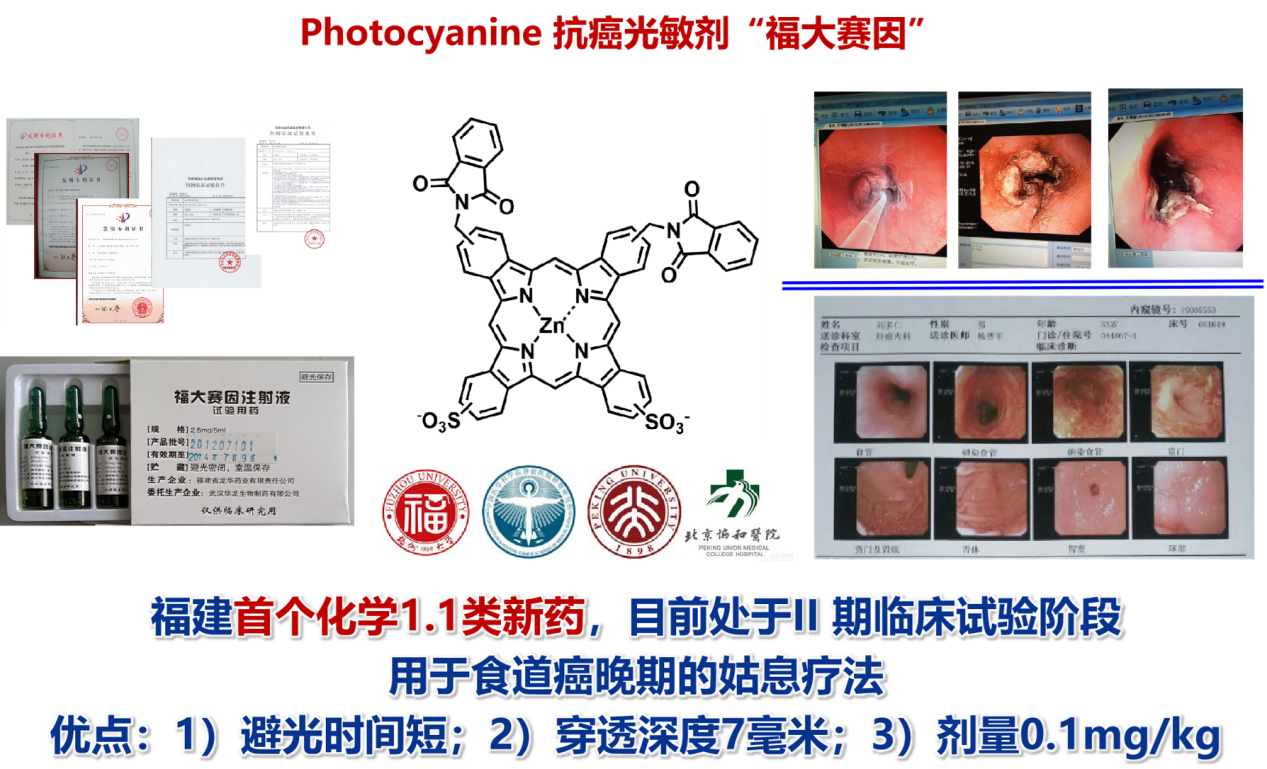 经细胞试验和动物试验表明,与目前临床试验所用的血卟啉相比,福大赛因具有药效高、毒性小的优点。1998年,国家科技部生命科学中心向全国征集新药研究项目,全国各地上报了132项。该中心组织专家论证后,筛选出19项,其中有福大功能材料研究所上报的抗癌光敏剂,并列入国家科技攻关计划《十个创新药物的研究与产业化开发》项目。本药已于2000年获得国家发明专利授权,名称为《酞菁锌配合物及其制造方法和在制抗癌药中的应用》(专利号为ZL96117137.5)。在优化工艺的基础上,2006年5月获得新专利《酞菁金属配合物的新制备方法》(专利号为ZL200410013492.4)。2006年3月,该新药通过了省科技厅组织的重大项目鉴定,鉴定委员会一致认为:该第二代新型抗癌光敏剂的研究成果已达到国际先进水平,被批准生产后,将成为“世界首次上市的新药(新化学实体)”。目前,该成果已与福建省龙华药业有限责任公司共同完成了具有自主知识产权的国家I类新药抗癌光敏剂的注册申请,已获国家食品药品监督管理局批准进入II期临床试验,。