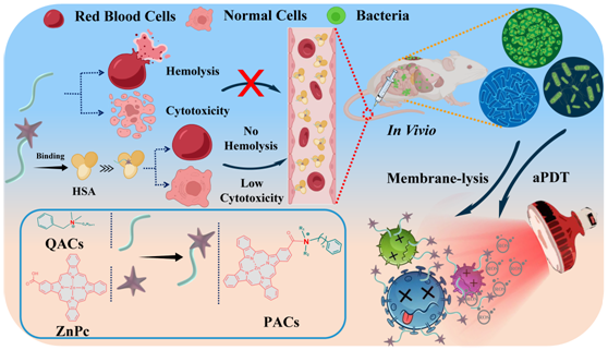 为了提高QAC的抗菌活性和生物安全性,本研究基于一种常见的季铵盐化合物苯扎溴铵的化学结构,用酞菁基取代了其长烷基链,同时保留了苯扎烷烃的苄基或苯基,构建了一类新的含酞菁的QACPAC)。首先,得益于酞菁环的高度刚性和疏水性,PAC在与细胞膜相互作用的过程中可减少QAC的熵损失,进而促进QAC对细菌细胞膜的破坏。此外,酞菁作为一种光敏剂,可通过抗菌光动力疗法(aPDT)效应进一步提高QAC抗菌活性;其次,我们之前研究证明的酞菁对人血清白蛋白(HSA)具有很强的结合亲和力(DOI: 10.7150/thno.852710.4028/www.scientific.net/AMR.335-336.363),因此PAC在血管中可结合HSA,从而降低其对于血细胞以及对内皮细胞的急性毒性。PAC在有效浓度下,具有很强的抗菌活性,而不会引起溶血和细胞毒性。在小鼠脓毒症模型中, PAC在减少细菌负荷、改善器官功能障碍和提高生存率方面的效率明显高于临床一线抗生素万古霉素。总之,我们该项研究提出了一种新的策略来QAC的提高抗菌活性和生物安全性,并且扩大了QAC在全身感染治疗中的应用范畴,为构建新的皮肤和体内抗菌药物提供了新的设计思路和实践。