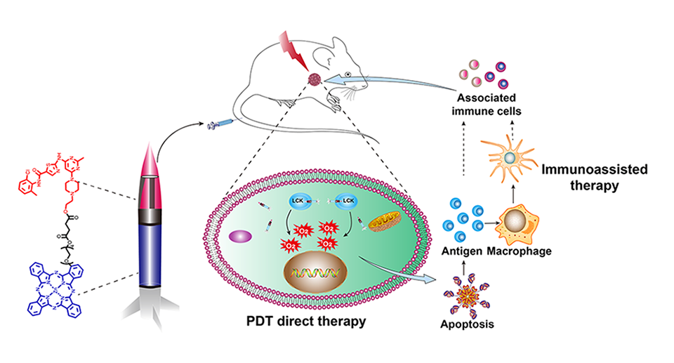 基于该课题组近些年来小分子靶向光敏剂的研究,该课题组研究设计并合成了一种新型的靶向光敏剂化合物4,该化合物结合了高效光敏剂酞菁锌和酪氨酸激酶抑制剂达沙替尼。其中,酞菁锌母环和达沙替尼活性结构域分别作为光动力和靶向部分。研究结果表明,化合物4对白血病CCRF-CEM细胞/肿瘤组织表现出高亲和力,并优先被机体排除。同时,化合物4具有良好的光动力活性和肿瘤退行性。更值得注意的是,化合物4诱导的PDT能明显增强免疫应答,导致更多的免疫细胞产生,进而对癌细胞产生继发性破坏以根除残留的肿瘤细胞。