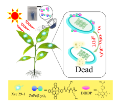 在这项研究中,本中心的博士生蒋利宾将光动力方法应用到农业抗菌领域中,提供一种低毒、高效的植物病害防治用复合抗菌药剂。有机光敏剂硼二吡咯亚甲基(BODIPY)的衍生物在540 nm附近具有最大吸收光谱,接近在海平面条件下的太阳最大辐射波长 (520 nm),因此可以利用太阳光直接产生活性氧杀灭病菌,而且,光敏剂的用药量是铜类化学农药用药量的不到10%!同时,酞菁作为复合抗菌药剂的佐剂,提高了BODIPY衍生物的光稳定性。