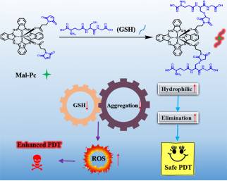 我们设计合成新型具有降低GSH水平和聚集且可快速清除的光敏剂Mal-Pc。在这项工作中,我们在酞菁硅的轴向上引入两个亲电基团马来酰亚胺,巧妙地同时提高光敏剂的抗肿瘤活性和安全性。具有一定疏水性的Mal-Pc可更快地进入肿瘤细胞(2小时达到高峰,比对照组早16小时),并与肿瘤细胞内过量的GSH反应生成亲水性的GS-Pc 轭合物,从而有效降低GSH水平(10倍);进一步地,其GSH的亲水性和空间位阻降低光敏剂聚集;GSH和聚集的同时降低有效地提高其光动力活性(9-17倍);更为重要的是,高亲水性的GS-Pc 轭合物使光敏剂可以快速从正常细胞中清除(比对照组快36倍),从而有望降低对正常组织的光毒性并缩短避光时间。