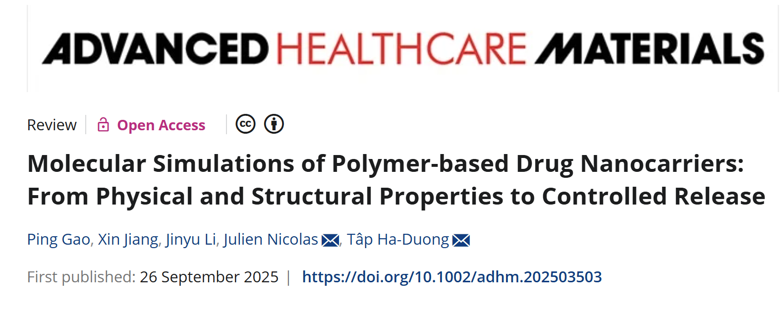 该论文第一作者为福州大学李金宇教授团队高萍博士,第二作者为硕士研究生江鑫,通讯作者为法国巴黎萨克雷大学的 Julien Nicolas 教授和 Tâp Ha-Duong 教授。文章详见:P. Gao, X. Jiang, J. Li, J. Nicolas, and T. Ha-Duong, Molecular Simulations of Polymer-based Drug Nanocarriers: From Physical and Structural Properties to Controlled Release. Adv. Healthcare Mater. (2025): e03503. https://doi.org/10.1002/adhm.202503503