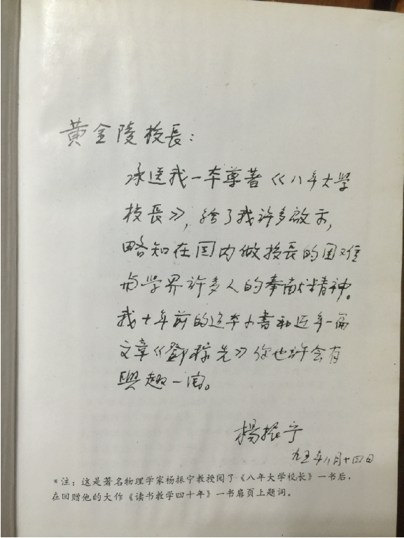 在《读书教学40年》书的扉页上写下:黄金陵校长:承送我一本尊著《八年大学校长》,给了我许多启示,略知国内做校长的困难与学界许多人的奉献精神,我十年前这本小书和近年一篇文章《邓稼先》你也许会有兴趣一阅。杨振宁( 95.8.14)