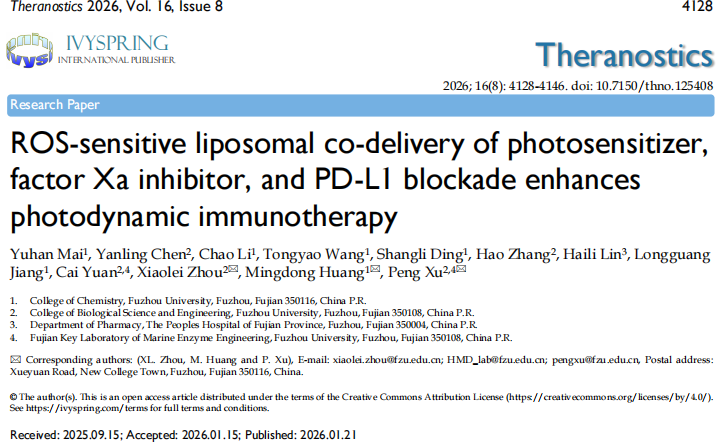 文章信息:Mai Y, Chen Y, Li C, Wang T, Ding S, Zhang H, Lin H, Jiang L, Yuan C, Zhou X, Huang M, Xu P. 2026. ROS-sensitive liposomal co-delivery of photosensitizer, factor Xa inhibitor, and PD-L1 blockade enhances photodynamic immunotherapy. Theranostics. 16(8):4128-4146.