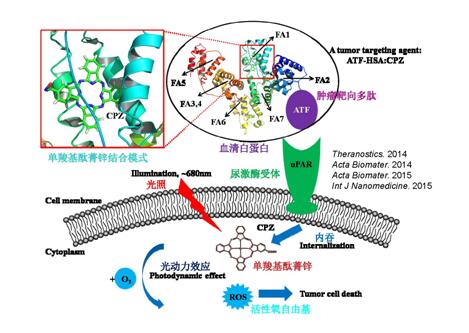 图3.Bifunctional drug carrier ATF-HSA targets to tumors through tumor marker (urokinase receptor, uPAR) and enhanced permeability retention (EPR) effect, and demonstrated enhanced photodynamic therapeutic (PDT) effect. ATF-HSA also carries diagnostic and cytotoxic agents (CPZ in this case) to destroy and/or detect tumor cells.