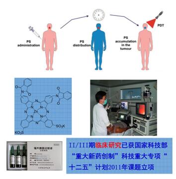 1.光动力治疗:光动力治疗(Photodynamic Therapy, PDT)是一种治疗疾病的新方法,该方法是通过光敏药物与特定波长的光及氧的配合产生细胞毒剂,对病变细胞及组织产生杀伤作用。PDT与经典的治疗疾病方法相比,具有靶向性、微创、非侵蚀性、无耐药性、可多次使用等优势,近年来备受瞩目。本中心合成了系列光敏剂,其中“福大赛因”为1.1类光动力抗癌新药、正在开展II期临床试验。