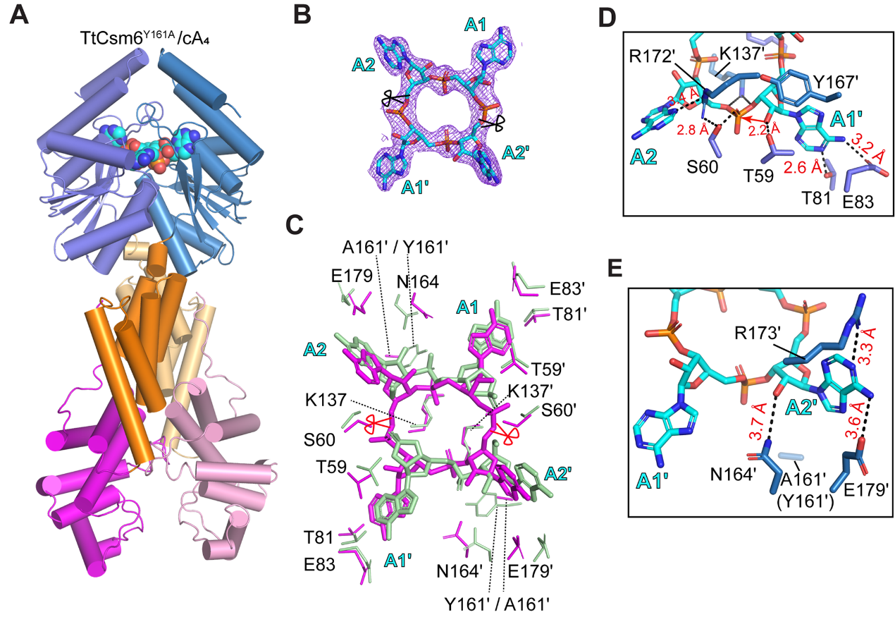 图1. TtCsm6与cA4复合物的晶体结构及二者的相互作用细节图。
