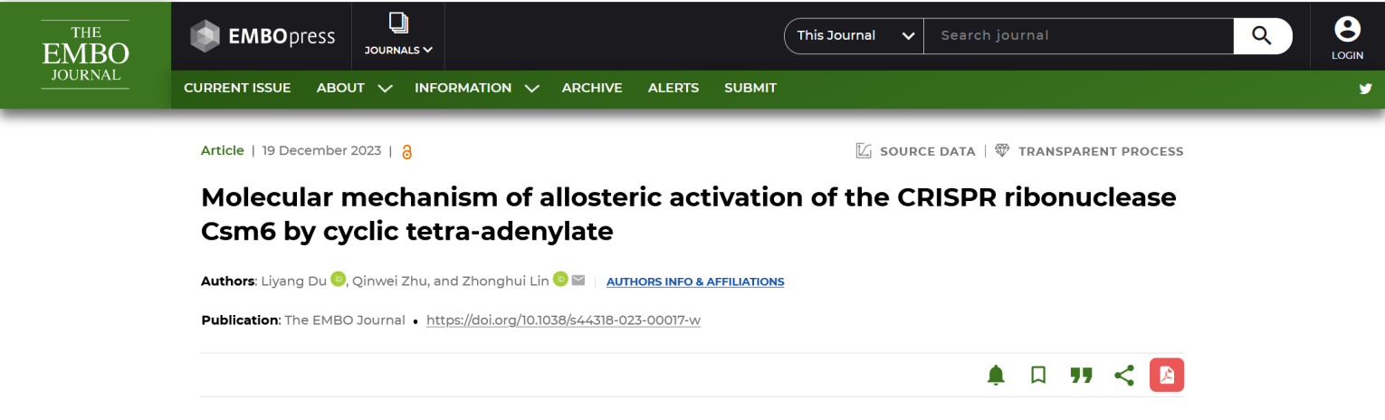 2023年12月19日,我中心林忠辉教授团队在国际生物学领域权威刊物《The EMBO Journal》(最新影响因子11.4)在线发表了题为“Molecular mechanism of allosteric activation of the CRISPR ribonuclease Csm6 by cyclic tetra-adenylate”的研究成果。这是林忠辉教授团队于2023年2月在《Nucleic Acids Research》杂志上发表论文揭示了环状核酸酶Sso2081的分子机制后,在细菌中III型CRISPR天然免疫系统研究领域取得的又一个重要研究成果。
