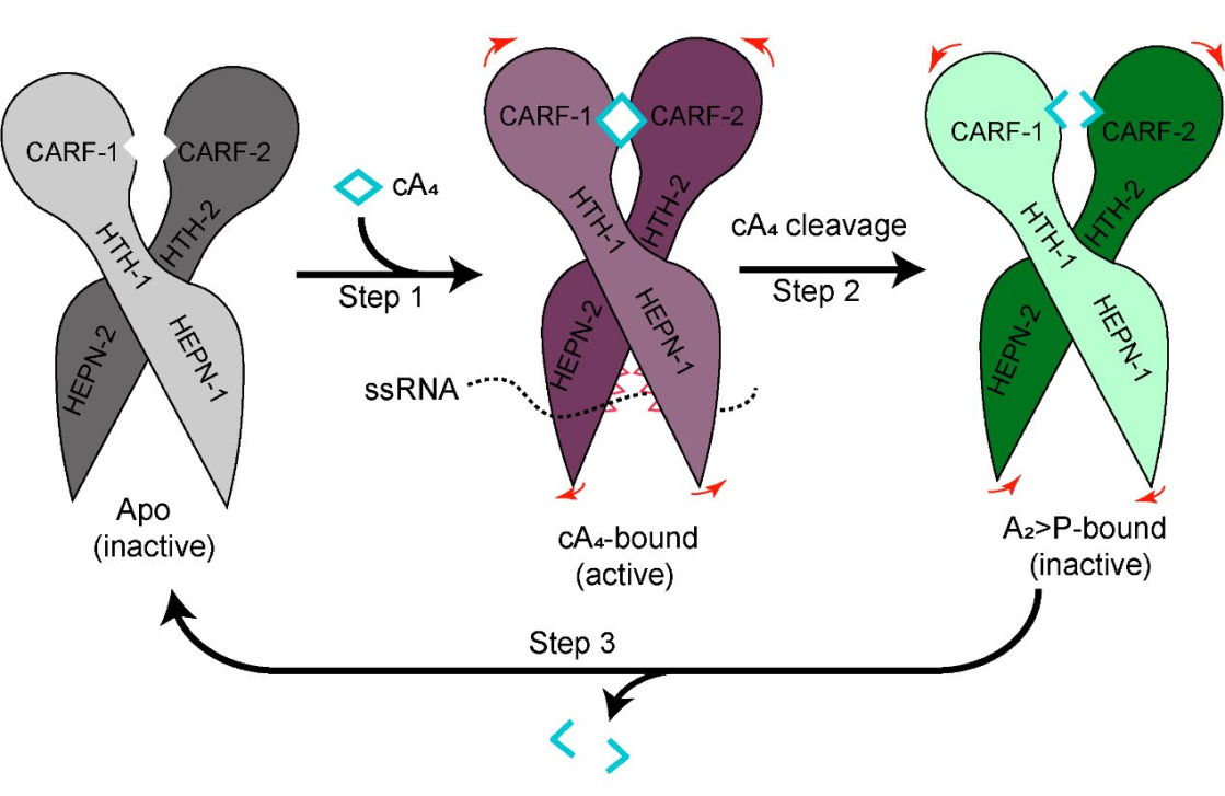 图2. cA4介导的TtCsm6核糖核酸酶变构激活机制的示意图。