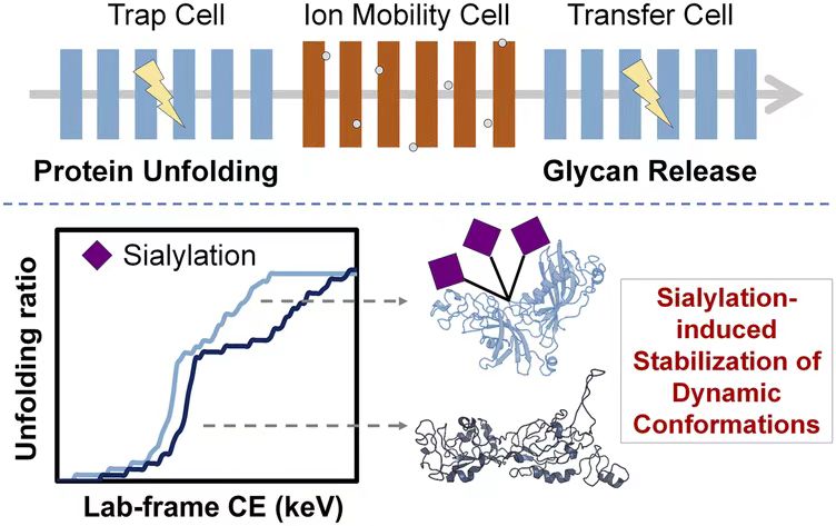 李金宇教授团队与南开大学化学学院李功玉研究员团队合作,结合双方分别自主开发的糖型分辨去折叠离子淌度质谱方法和结构质谱指引下的分子动力学模拟技术,成功揭示了唾液酸化修饰与糖蛋白构象稳定性之间的复杂关系,系统阐明唾液酸化调节蛋白动态三维结构的分子机制,为蛋白低丰度翻译后修饰结构的快速高效解析提供一种新思路(Chem. Sci. 2024, 14431)。南开大学22级硕士生王雅梅和中心19级直博生刘以畅(现为南通大学药学院讲师)为该工作共同第一作者,李功玉研究员和李金宇教授为共同通讯作者。